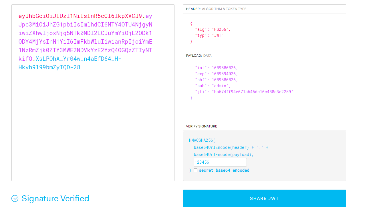 Header为eyJhbGciOiJOb25lIiwidHlwIjoiand0In0.eyJpc3MiOiJhZG1pbiIsImlhdCI6MTY4OTU4NjEzMSwiZXhwIjoxNjg5NTkzMzMxLCJuYmYiOjE2ODk1ODYxMzEsInN1YiI6ImFkbWluIiwianRpIjoiZjU3NjE4ODYwOGIwYWQ1N2FhMTc5NzdlOGY3YzJkOWIifQ.